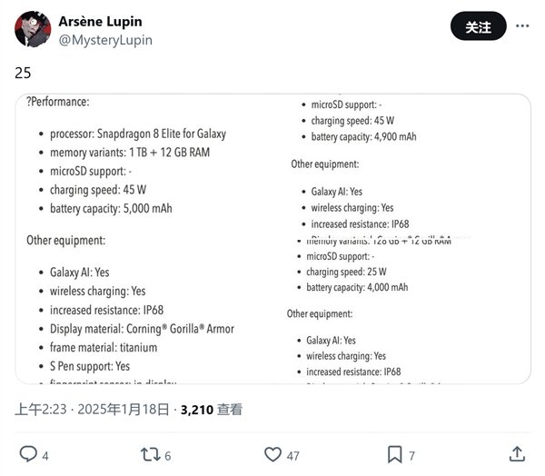 首发高频版骁龙8Elite!三星Galaxy S25系列详细参数出炉:全面向12GB内存迈进