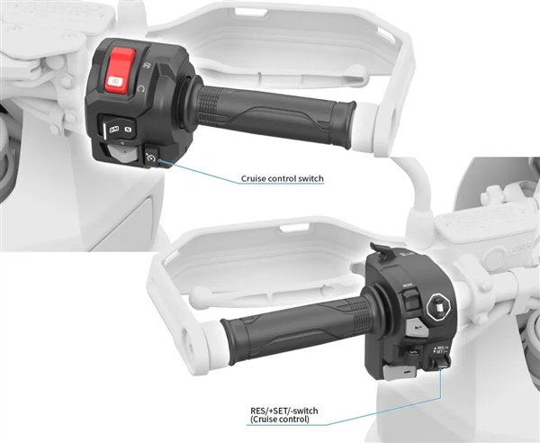 不止如此,新车还通过升级新增了定速巡航功能,只需通过把手上的按键就可启用,对于长途旅行,尤其是高速骑行而言非常便捷,也能一定程度节省骑手体力。