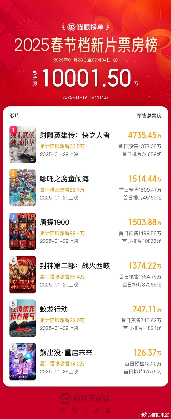 IT之家 1 月 19 日消息,2025 春节档影片今日开启预售,据猫眼专业版数据,2025 年 1 月 19 日 14 时 41 分,2025 年春节档新片预售总票房破 1 亿,《射雕英雄传:侠之大者》《哪吒之魔童闹海》《唐探 1900》分列 2025 年春节档新片预售票房榜前三。