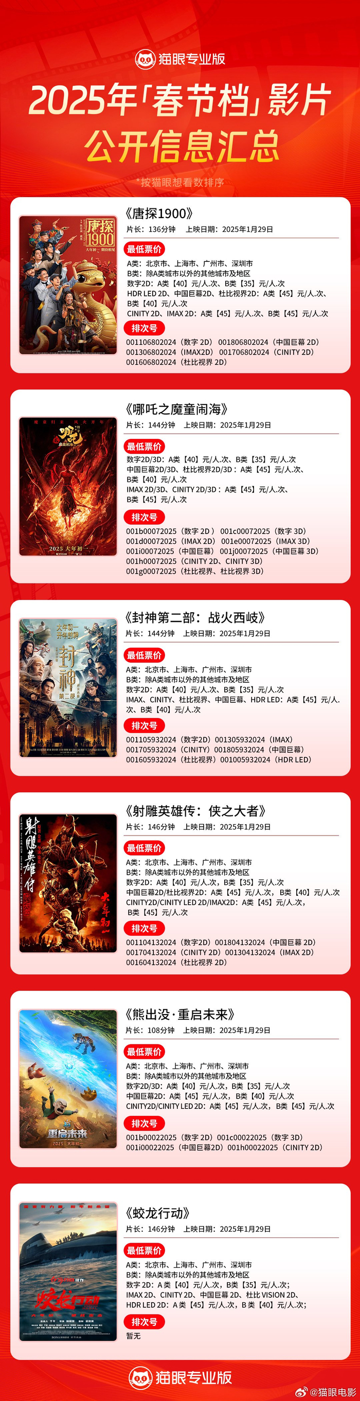 此外,截至当前 2025 春节档电影发行通知已全部释出,最低票价 35 元起,IT之家汇总如下: