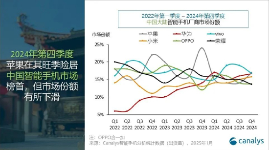 根据Canalys公布的数据,2024年第四季度中国智能手机市场出货量排名前五分别为苹果、vivo、华为、小米和OPPO,荣耀已经跌出前五;而从2024年全年来看,前五分别为vivo、华为、苹果、OPPO和荣耀,荣耀跌至第五名,出货量同比下滑3%。