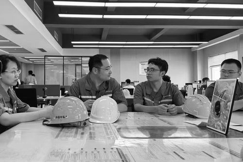 杨广雪(左二)在工程现场与团队进行讨论。