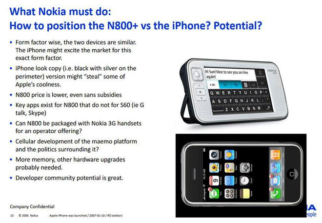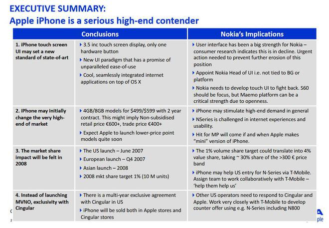 而诺基亚的一个九人团队在 iPhone 发布后的第二天就提交了一份内部报告,预见了这一趋势。报告摘要指出:苹果 iPhone 是一款高端竞争产品,其触摸屏 UI 可能会树立新的行业标杆,此外全新的 UI 范式带来了前所未有的易用性,以及流畅集成的互联网应用程序。