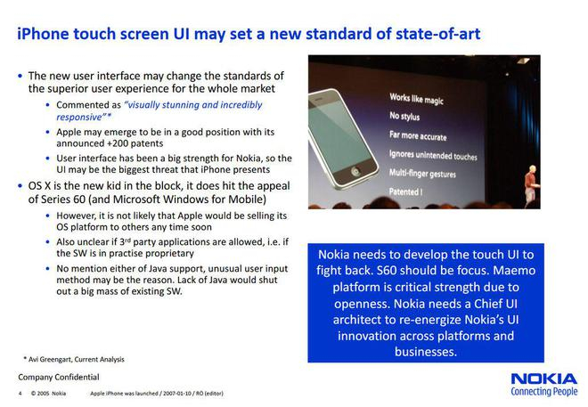 报告评价 iPhone 的 UI 为“视觉效果惊艳,响应速度极快”,建议诺基亚需要开发触摸 UI 来应对挑战,新的用户界面可能会改变整个市场对卓越用户体验的标准。