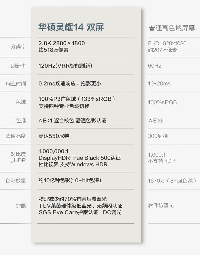 屏幕素质方面,两块屏幕的参数完全一致,均为14英寸、2.8K分辨率、120Hz刷新率、0.2ms响应的OLED华硕好屏,支持VRR智能刷新,色深10bit,色域达到100% P3影视级广色域,支持4种专业色域切换。并且逐台校色,ΔE<1,并通过潘通色彩认证、DisplayHDR True Black 500认证、杜比视界认证和TUV莱茵护眼认证,以及SGS Eye Care护眼认证。可以说,华硕灵耀14双屏2025的屏幕素质已经全方位超越传统笔记本屏幕。