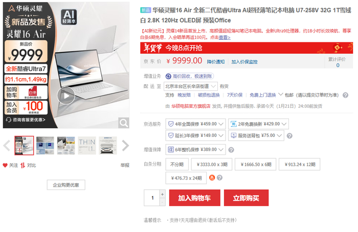 华硕灵耀16 Air搭载英特尔酷睿Ultra 7 258V,辅以32GB内存和1TB硬盘,首发9999元。同样支持京东6期免息,晒单返百元E卡等福利。