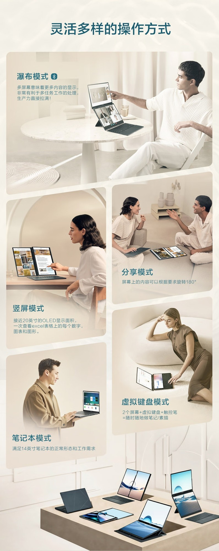 华硕灵耀14双屏2025的双屏设计也非常精妙,双屏可上可下、可左可右,搭配随机附赠的磁吸蓝牙键盘和4096级压感触控笔,能够提供包括瀑布模式、竖屏模式、分享模式、笔记本模式和虚拟键盘模式在内的5种使用模式。相比支持360°屏幕翻转的笔记本,华硕灵耀14双屏2025的模式更多、显示的内容更多、更易分享,多场景使用体验更加出色。