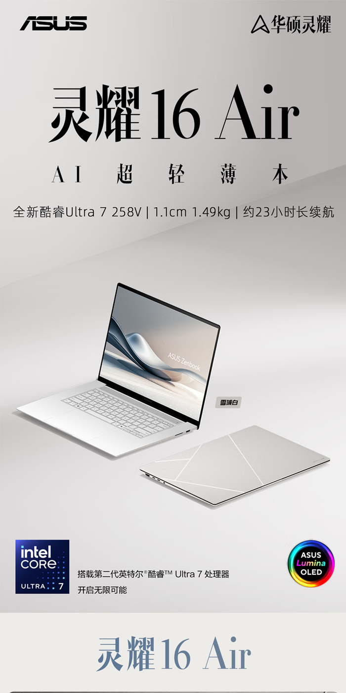 华硕灵耀16 Air作为一款16英寸超轻薄产品,搭载的是全新酷睿Ultra 7 258V,AI总算力进一步提升到115 TOPS。它的机身薄度只有惊人的1.1cm,重量也只有与14英寸机型相近的1.49kg,极致轻薄。此外它还有Ceraluminum高科技陶瓷铝加持,质感极为出众。搭载16英寸、2.8K、120Hz的OLED华硕好屏,内置小硕知道,并能够提供约23小时的惊人续航能力,是高品质超轻薄笔记本中的标杆级产品。