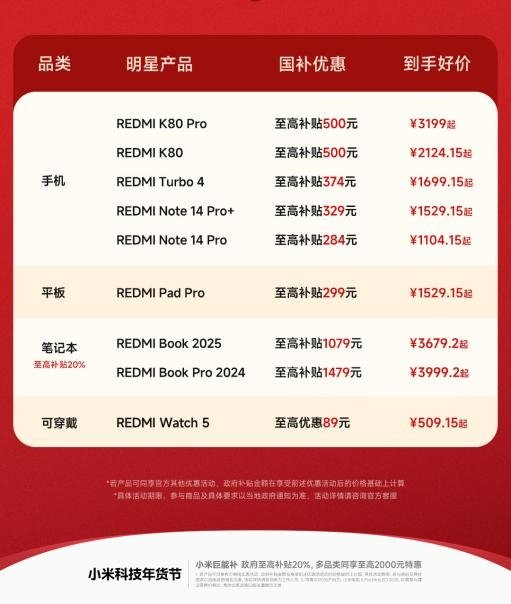 REDMI K80 在补贴后最低到手价仅为2124.15 元,2025年首款新机REDMI Turbo 4 12GB+256GB 补贴后到手价1699.15元。