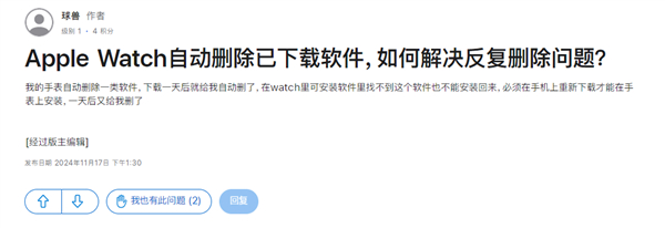 值得让人关注的是,在苹果官方网站Apple Watch社区,也有果粉留言称:Apple Watch自动删除已下载软件,如何解决反复删除问题?而且在这一问题下面,显示有两位果粉也出现过此类问题。