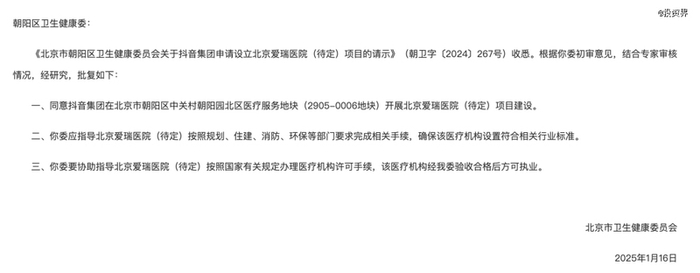 投资界获悉,日前北京市卫生健康委员会官网发布《关于同意抖音集团设立北京爱瑞医院(待定)项目的批复》的通知,并予以相关指导要求。