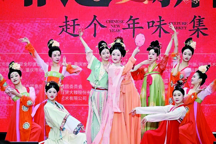 渝中区解放碑,“非遗贺新春 赶个年味集”开街仪式现场舞蹈表演。