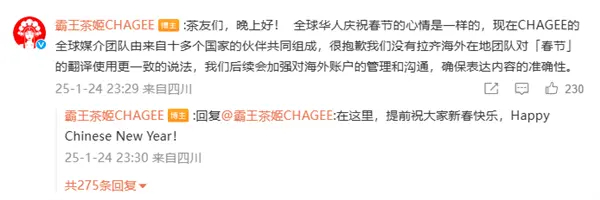 1月24日深夜,霸王茶姬官方微博和官方公众号发布《全球同庆首个非遗春节,HAPPY CHINESE NEW YEAR!》文章,并在评论区就“春节”一词翻译不当致歉。