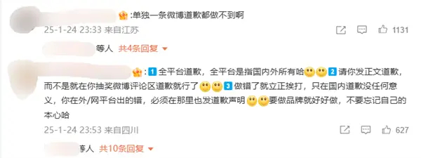 不过,对于霸王茶姬的道歉,许多微博网友并不认可,网友表示:“单独一条微博道歉都做不到啊”“搞笑不,道歉竟然是在抽奖博的评论区”“全平台道歉,全平台是指国内外所有哈,请你发正文道歉,而不是就在你抽奖微博评论区道歉就行了”。