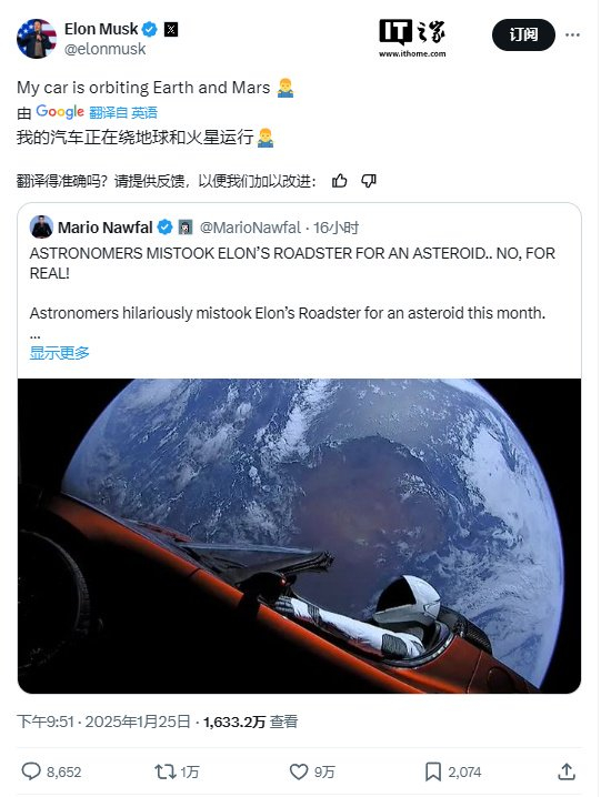 据IT之家了解,这辆特斯拉跑车由 SpaceX 的猎鹰重型火箭于 2018 年 2 月发射升空,是特斯拉 CEO 埃隆・马斯克(Elon Musk)的个人座驾。跑车上还搭载了一个名为“星际人”(Starman)的假人模型以及多台摄像机,SpaceX 曾分享过由这些摄像机拍摄的视频片段。马斯克在社交媒体 X 上对此事回应称:“我的车正在环绕地球和火星飞行”,并附上了一个耸肩的表情符号。
