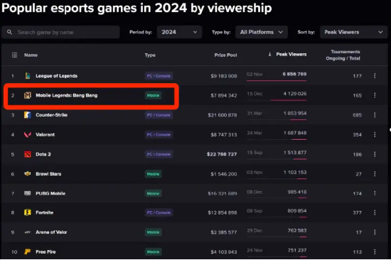 尽管国内玩家对这款游戏并不熟悉,但实际上,该游戏在海外已经运营8年,具有广泛的知名度,在多家海外机构统计的2024年全球十大热门电子竞技游戏中,《决胜巅峰》海外版本《Mobile Legends:Bang Bang》位列第二,仅次于《英雄联盟》。
