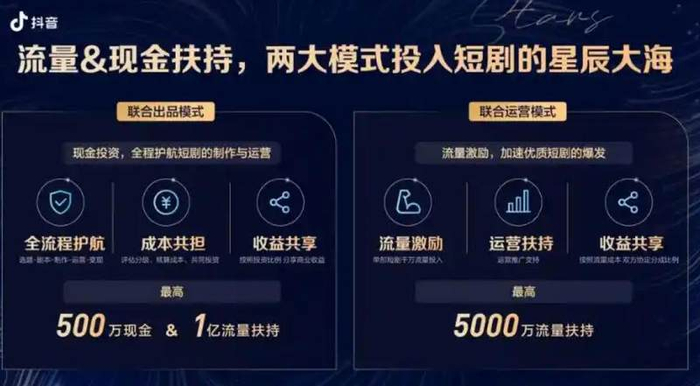 抖音于2024年1月推出“辰星计划”,面向影视公司、MCN机构、个人创作者等更广泛的行业伙伴,发布联合出品、联合运营两大合作模式,推出最高500万现金和1亿流量扶持的方案。2024年11月,抖音发布影视精品短剧合作政策,在此前“辰星计划”的基础上,对投资出品和联合运营两大模式进行了升级,并推出保底收益等多项经营扶持举措。