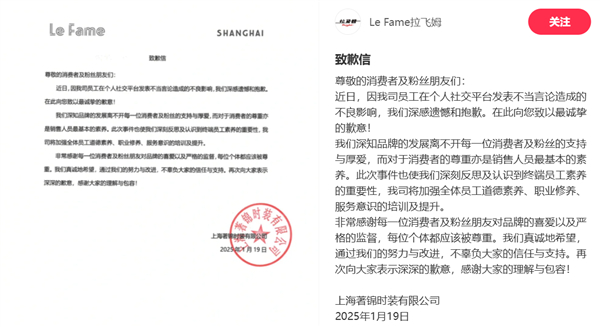 这些引发刘亦菲粉丝不满,不少人遂向品牌方进行了举报,随后“Le Fame拉飞姆”发布了处罚公告和致歉函。