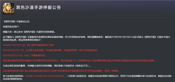 快科技1月27日消息,2024年11月27日,腾讯《黑色沙漠》手游突然发布停服公告,根据公告,腾讯将于今天11点正式停止《黑色沙漠》手游在中国大陆地区的运营,届时,将关闭游戏服务器,关闭游戏官网,用户无法登陆游戏。