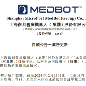 1月24日,微创机器人(2252.HK)披露业务更新公告,公司旗下腔镜、骨科、血管介入核心产品的综合订单量已累计超过100台。