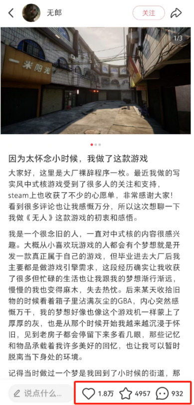 此外,在另一个游戏氛围相对没那么浓的平台小红书里,无郎那篇《因为太怀念小时候,我做了这款游戏》的宣传贴,甚至在游戏尚未发布前,就已经吸引了上万的点赞和收藏。