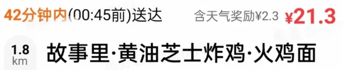 除了常规的补贴外,平台还会发放天气补贴,有部分骑手在春节前夕两天接到了高至20多元的单价。