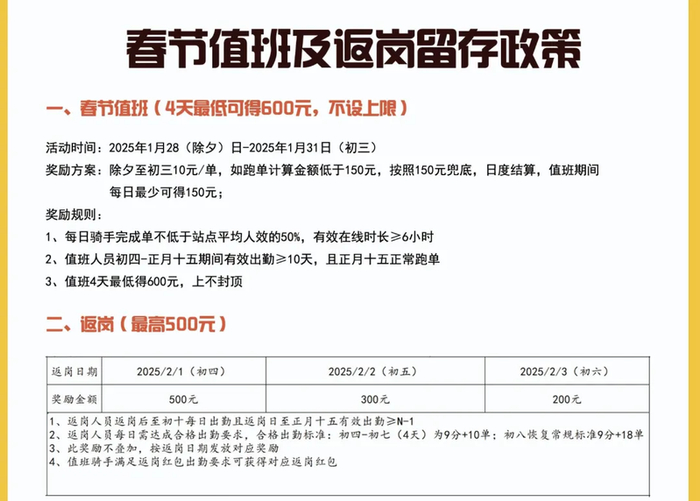 另一套单价在8~10元左右,虽然单价没有那么高,但是有现金奖励补贴,骑手过年期间留岗每天在线5小时,坚持签到满一定的天数就有3000多元的奖励。