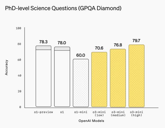 在科学领域评测中,o3-mini的高推理强度模式在PhD级科学问题(GPQA Diamond)上达到79.7%的准确率,显著优于前代模型。在生物、化学和物理等高难度学科问题上,其高推理强度模式的表现与o1相当。