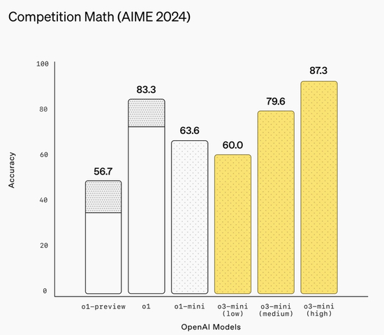 数学推理方面,o3-mini于AIME 2024数学竞赛中表现优异。使用高推理强度时,其准确率达到87.3%,全面超越o1。即便在低推理强度模式下,其表现也能与o1-mini比肩。