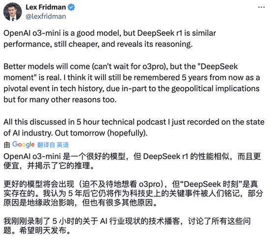 就像Lex Fridman说的,“OpenAI o3-mini是一个很好的模型,但DeepSeek R1的性能相似还更便宜,并且展示推理过程(目前大家反映o3-mini并没像奥特曼说的那样看到思维链显示)。