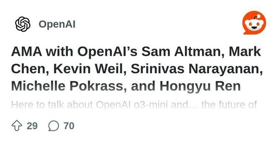 o3-mini发布后,OpenAI CEO Sam Altman带领首席研究员Mark Chen、首席产品官Kevin Weil、工程副总裁Srinivas Narayanan、API 研究主管Michelle Pokrass,和o3-mini团队研究主管Hongyu Ren,上阵Reddit和网友们来了场互动Q&A。