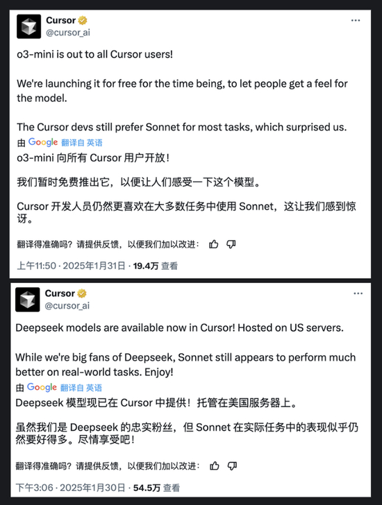 编程软件Cursor算是手快的,最新两条推文相继宣布DeepSeek模型和o3-mini都已经整合进来,但对平台的开发人员们仍然最爱Claude Sonnet“表示很惊讶”。