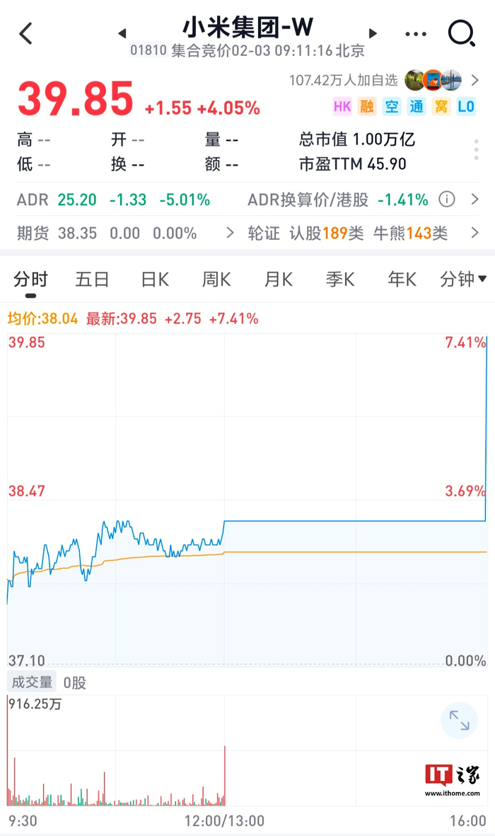 IT之家 2 月 3 日消息,小米集团股价今日突破 39 港元再创新高,达到 39.85 港元(IT之家备注:当前约 37.3 元人民币),市值达 10000 亿港元。