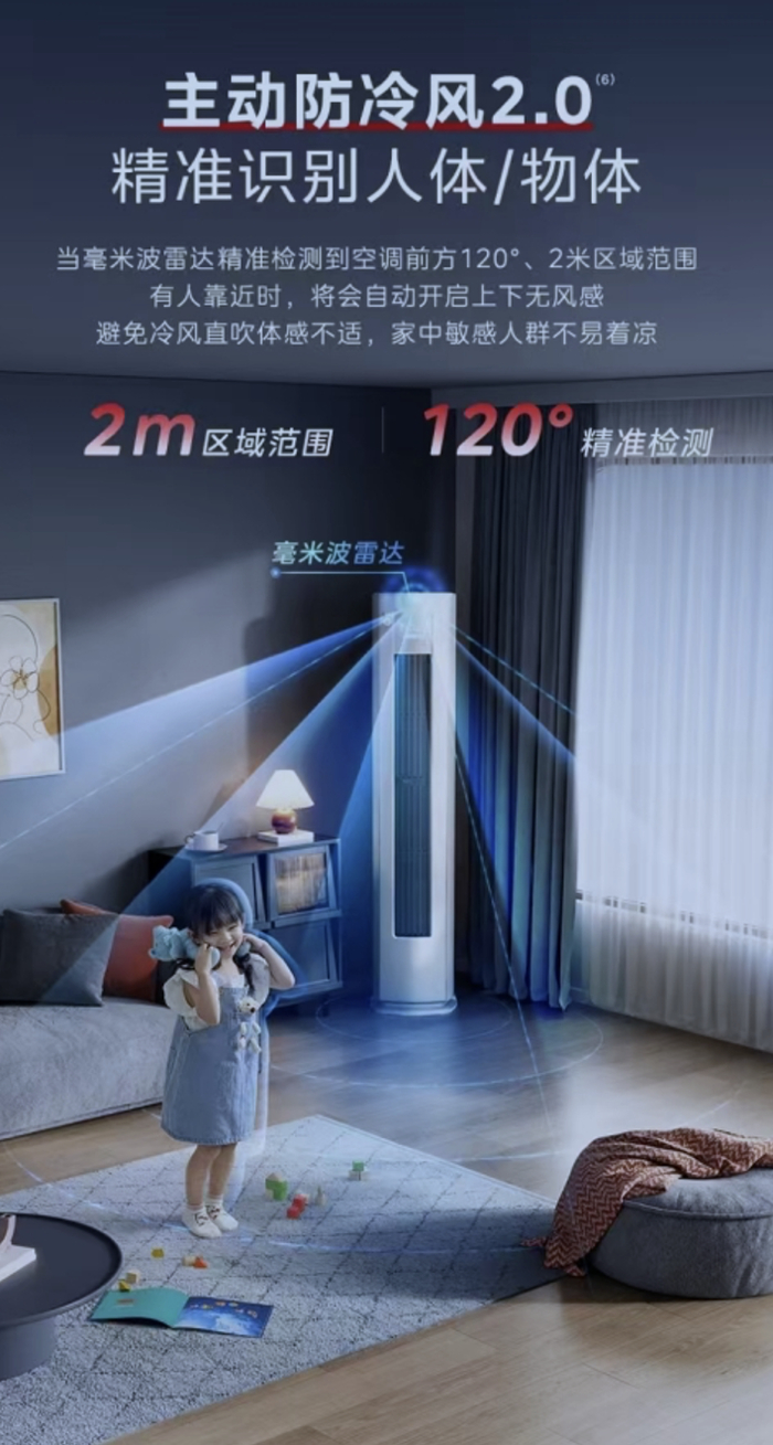 美的空调已经推出了风语者系列、星睿系列、新觅系列以及舒适星系列等多个无风感产品系列,实现了无风感系列产品的全场景覆盖,为消费者提供了更为丰富的选择。星睿柜机搭载了毫米波雷达技术,当毫米波雷达精准检测到空调前方120°、2米区域范围有人靠近时,将会自动开启上下无风感,主动防冷风,避免冷风直吹,呵护家中敏感人群不易着凉。舒适星挂机制冷模式下可一键开启无风感模式,配合智控温功能,先制冷降温,室温达到舒适温度自动调高,避免贪凉忘记调温引起身体不适,还具有三种抽湿模式,告别湿热,保持干燥舒适。