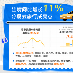 2月5日,全球自驾游平台租租车发布了《2025春节全球自驾游报告》。报告显示,2025年春节期间国内租车订单量同比增长5%,国际租车订单同比增长超11%。整体来看,出行高峰不再集中于某几天,1月22日至1月31日之间持续处于峰值阶段,较为平均,反映出游客的出行情绪高涨,出行意愿强烈,且错峰出行趋势明显。