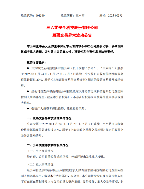 公告显示,360股票在2025年1月24日、1月27日及2月5日连续三个交易日内累计涨幅偏离值超过20%,属于《上海证券交易所交易规则》规定的股票交易异常波动情形。