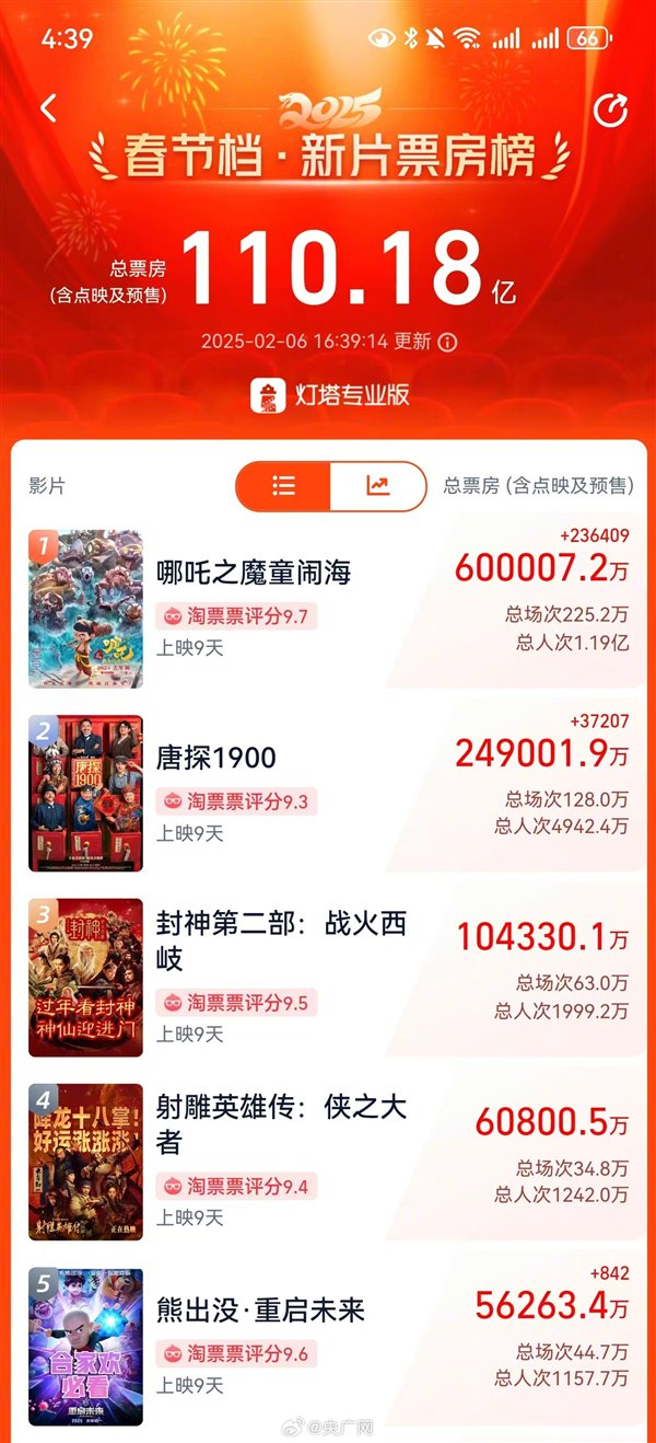 截至目前,《哪吒之魔童闹海》 实时总票房破60亿元,累计观影人次达1.19亿。