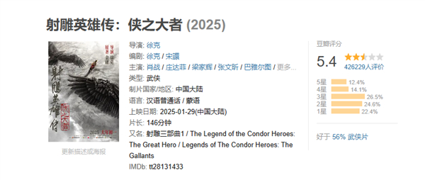 截稿前,《射雕英雄传:侠之大者》豆瓣评分为5.4分,超42万豆瓣用户打分。