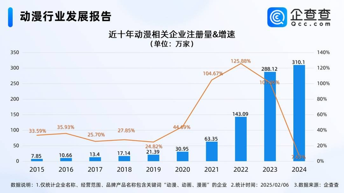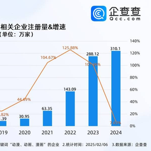 企查查数据显示,国内现存动漫相关企业682.46万家。近十年动漫相关企业注册量经历了快速增长,尤其在2020年至2023年期间,注册量和增速均有大幅提升。其中2021年动漫相关企业全年注册量激增104.67%至63.35万家,而后连续两年保持高速增长,2024年全年注册量首次突破300万家,达310.1万家。截至目前,今年已注册14.74万家相关企业。