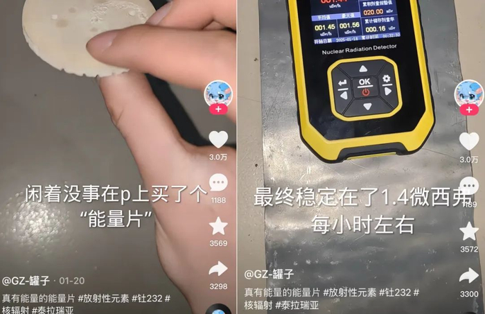 就在之前,一位视频博主还随手买了个「能量片」玩,结果也真检测出能量来了,最高2.2 μSv/h的辐射量。对于单次接触来说数值不高,但如果是长期、大量接触,就不太好说了。