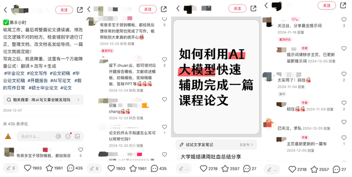 在B站、小红书、抖音等平台搜索“AI代生成”或者“AI写作”等关键词,就能检索到大量相关内容。有视频教学介绍如何用AI工具写出完美论文的,还有不少店铺售卖AI写作工具,俨然已经形成了一套赚钱的生态。