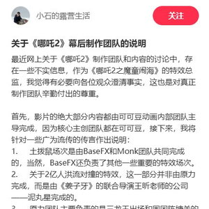 IT之家 2 月 8 日消息,今年春节档上映的《哪吒之魔童闹海》票房已经突破 70 亿,超过《神偷奶爸 2》进入全球影史前 60。伴随这部影片的爆火,一些不和谐的声音也在网上出现,视效总监石超群对此进行了回应。