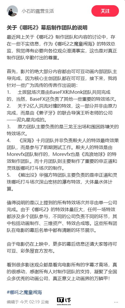 IT之家注意到,石超群还提到,以上提到的所有特效场次并非由单一公司完成。由于《哪吒 2》的特效体量巨大,任何一场特效都涉及多个团队参与,不同的公司负责不同的环节,其中包括动画制作、三维资产、特效合成等。这些所有团队在电影的幕后名单中都有清晰的环节展示。