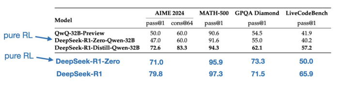 纯 RL,如 DeepSeek-R1-Zero,它表明推理可以在没有监督微调的情况下成为一种学习行为。