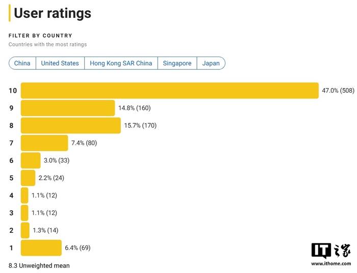 《哪吒之魔童闹海》用户评分中,有超 500 人给出了 10 分满分,当前未加权评分为 8.3,与加权评分相差不大。
