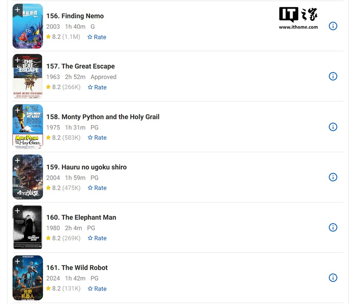 如果《哪吒之魔童闹海》海外口碑能够维持 8.2 分,那么最终成绩有望和《海底总动员》《哈尔的移动城堡》等经典动画电影 IMDb 评分持平,后两者都是在 IMDb Top 250 榜单中排名 160 左右。不过,也可能出现类似《流浪地球 2》的情况,在“加权”后评分骤降。