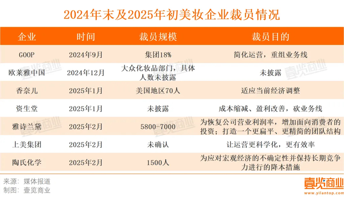 壹览商业梳理2024年末及2025年初7家美妆企业裁员情况发现,除了宏观经济原因,企业内部也希望通过简化运营的方式追求更高的人效比。