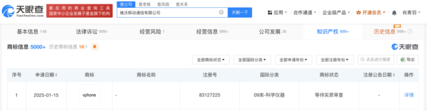 天眼查知识产权信息显示,近日,维沃移动通信有限公司申请注册“vphone”商标,国际分类为科学仪器,当前商标状态为等待实质审查。