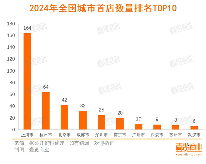 从城市分布看,全国首店仍聚集在一线及新一线城市。其中,上海以吸引164家全国首店,居一众城市首位;杭州、北京、成都位列其后,年内分别有64、42、32家全国首店落地。