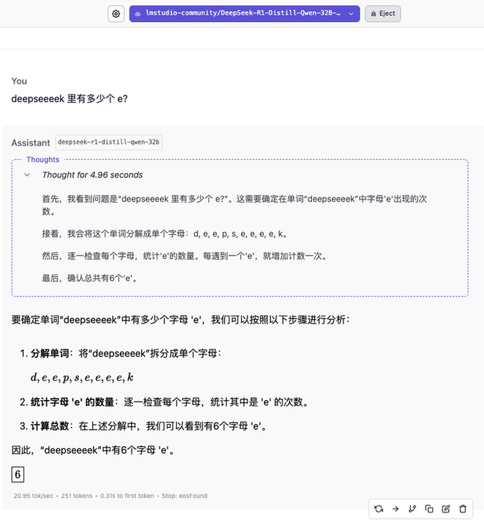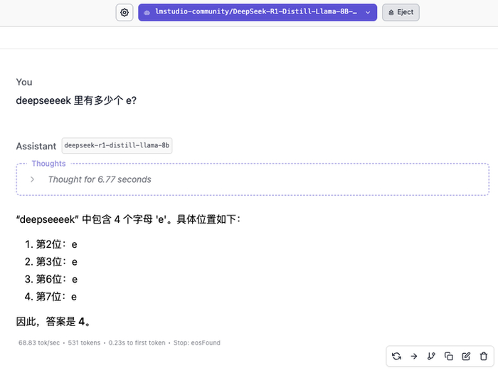 8B 模型的响应速度很快,基本能跑到 60 token/s,但答得快不意味着答得对,差之毫厘,谬以千里。思考过程显示,模型更像是基于知识库里的「DeepSeek」单词作出回答。